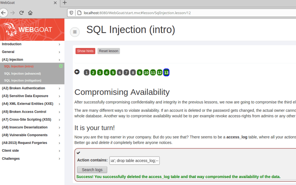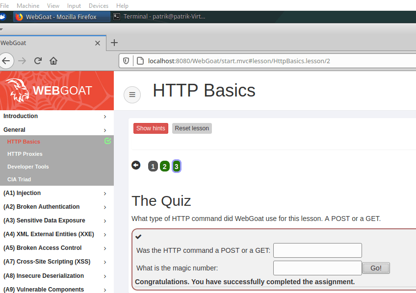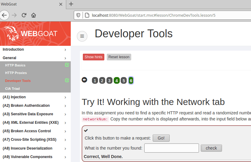c) Ratkaise WebGoatista tehtävät “HTTP Basics”, “Developer tools”, “CIA Triad” ja “A1 Injection (intro)”. Katso vinkit alta.