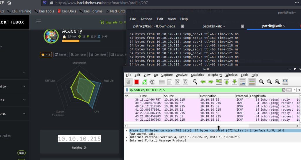 - Ensiksi loin virtual boxissa uuden NAT verkon (“testiverkko”), johon kiinnitin “Kalikoneeni” ja “Maalikoneeni”. Varmistin yhteyden koneiden välillä pingaamalla. Aloittaessani huomasin sieppaavani “vähän” liikaakin liikkuvaa tietoa, jonka seurauksena molemmat koneeni kaatuivat (tehtäviä tehdessä olin porukoilla tekemällä näitä “hieman” heikolla läppärilläni). Kokeilin uudestaan ja suodatin wiresharkin keräämään tietoja vain tästä yhdestä IP-osoitteesta (ip.addr eq 10.0.2.4). Noniin toivotaan, että lähtisi pelittämään –> wiresharkissa ainakin pingaamalla näkyy pelkästään juuri tämän ICMP-protokollan echo (ping) reply ja request pyynnöt. Tajusin myös ettei tuolla juuri luomassa maalikoneessa ole mitään portteja tai muuta auki… Päätin kokeilla HackTheBoxin koneita, jos tästä saisi hieman enemmän irti. Kirjauduin hacktheboxiin –> access –> latasin connection paketin –> sudo openvpn Pakki.ovpn –> nyt näen ip addr komennolla uuden verkkolaitteen “tun0” ja olen onnistuneesti HTB verkossa. Siirryin “active machines” välilehdelle ja valitsin “toivottavasti” helpoimman koneen “Academy”. Testasin yhteyttä pingaamalla konetta –> ping 10.10.10.215 ja homma pelittää. Kokeilin vielä (samanlailla kuin maalikoneesta) wiresharkilla kerätä tietoja pingauksesta ja oikeat tiedot sain sieltäkin ylös. Sitten tehtäviin.