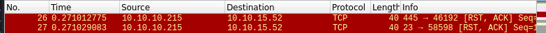 - 4. Wiresharkissa huomasin, kun seurasin tuloksia järjestyksessä, että ensin koneemme pingasi kohdekonetta, sen jälkeen koneemme suoraan lähetti ACK-paketin johon kohde vastasi RST-paketilla. Tämä vaikutti oudolta, mutta oletin että se johtui jo aikaisemmasta yhteyskokeilusta.