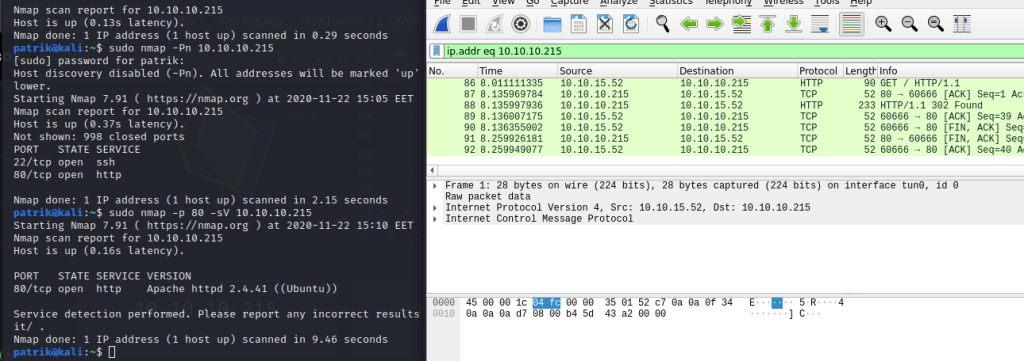 - 1.Kokeilin komentoja “nmap -sS 10.10.10.215” ja “sudo nmap -sS 10.10.10.215”