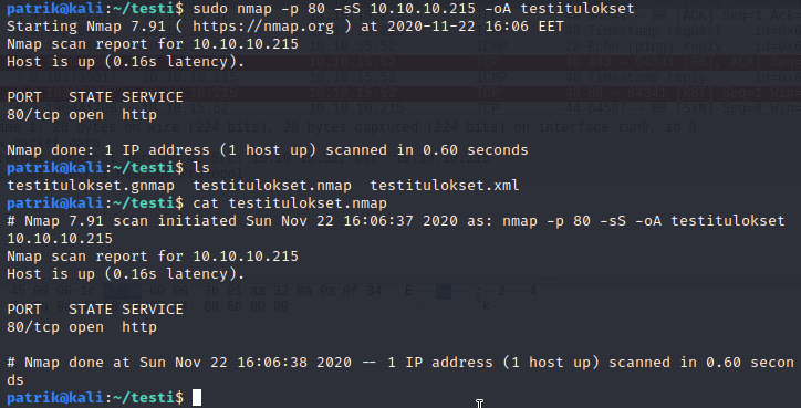 - 2. Kokeilin komentoa “sudo nmap -p 80 -sS 10.10.10.215 -oA testitulokset