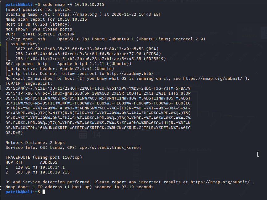 - 4.Kokeillaan komentoa “sudo nmap -A 10.10.10.215”