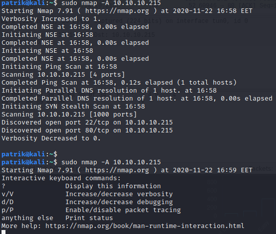- 2. v/V, pienellä v:llä kesken suorittamisen ( ajoin komennon sudo nmap -A 10.10.10.215), saadaan enemmän tulostetta ja tietoja eri vaiheista ja yhteyskokeiluista.