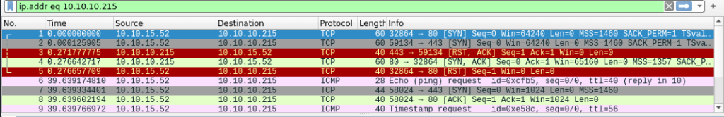 - 3. Tällä saadaan selville nopeasti onko kohdekone/koneet ylhäällä. Koneemme lähettää kohteeseen echo (ping) requestin, SYN- paketin porttiin 443 , ACK-paketin (80) porttiin ja timestamp requestin. Kohde koneelta saadaan RST ja RST/ACK -paketteja takaisin.