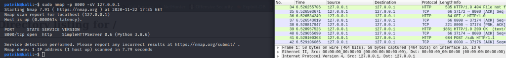 - Ajoin nmap-versioskannauksen omaan paikalliseen webbipalvelimeen komennolla: “sudo nmap -p 8000 -sV 127.0.0.1”
