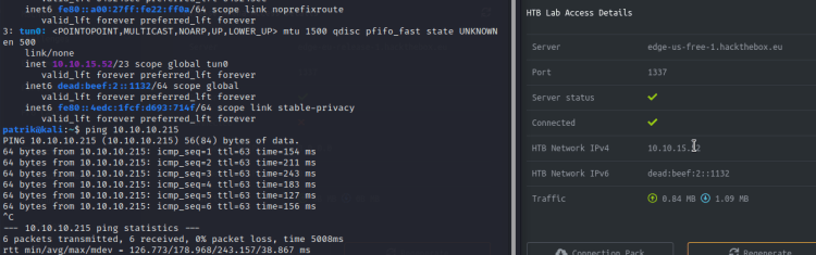 - Nyt näen ip addr komennolla uuden verkkolaitteen “tun0” ja olen onnistuneesti HTB verkossa. Tarkistin asian vielä “access” välilehden “HTB Lab Access Details” kehyksestä, joka näyttää yhteyden olevan kunnossa ja ipcalcin tuloksissa näytti yksityistä ip:tä sekä varmistin asian myös pingaamalla actiivista konetta “Academy” –> sudo ping 10.10.10.215