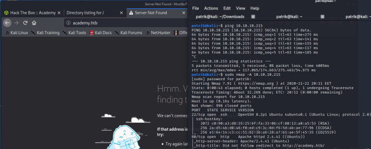 - sudo nmap -A 10.10.10.215–> skannasin “Academy” maalikoneen ja kuten näemme apache-palvelin on käytössä ja portti 80 on avoin.