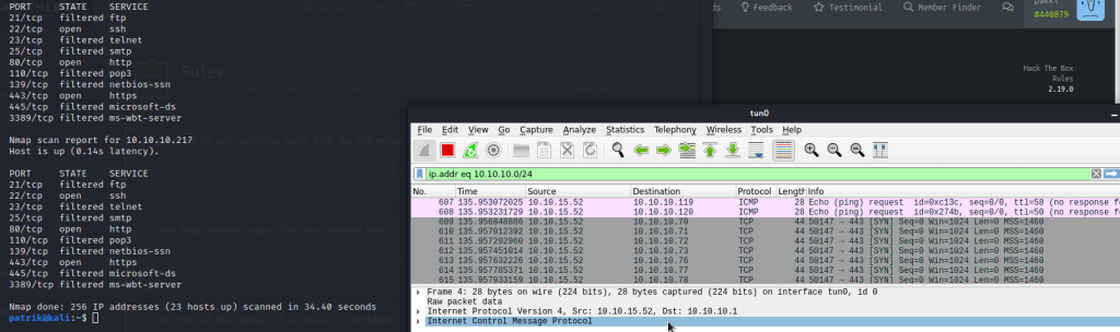 f) Tiedustele aktiivisesti HackTheBoxin verkko. Analysoi tulokset. Käytä nmap-porttiskanneria. Seuraa koko ajan porttiskannerin toimintaa snifferillä, kuten tshark tai wireshark. HTB:n ratkaisut yhdessä sovitun salasanan taakse, jotta emme spoilaa toisten kilpailua. Tämä on laaja tehtävä, koska analysoitavaa on paljon. Pelkät komentojen tulosteet ilman analyysia eivät riitä, pääpaino on tulosten selittämisellä ja tulkinnoillasi.