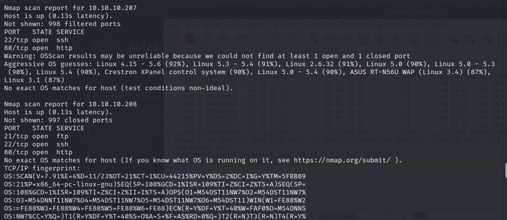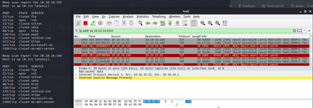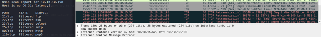 - Sitten esimerkkinä kohdekone 10.10.10.198, koneemme lähettää normaalisti ping requestit ja SYN-paketit, yrittää lähettää paketteja muutamaankin otteeseen, mutta mitään vasta kaikua ei tule. Nmap päättelee heidän yhteyskokeilujen olevan suodatettu esimerkiksi palomuurilla ja määrittää kaikkien porttien tilaksi “filtered”.