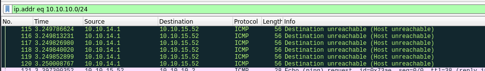 - Laitoin wiresharkin kuuntelemaan tun0 -verkkolaitetta (HTB-verkko) ja filtteröin sen vielä –> ip.addr eq 10.10.10.0/24