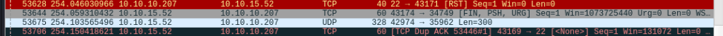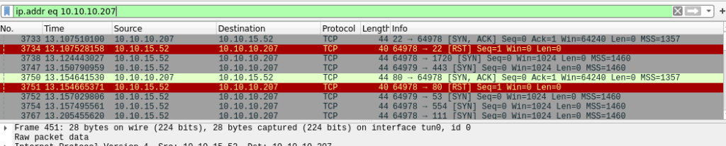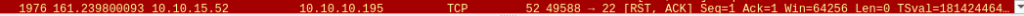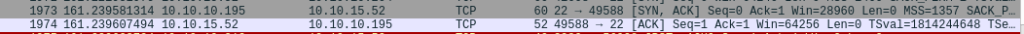 - 10.10.10.195 kone lähettää meille kuitenkin SYN, ACK -paketteja portista 22 ja heti perään koneemme lähettää takaisin ACK-paketin. Okei porttia kuunnellaan ja saamme sinne yhteyden, portti 22 on “Open” tilassa. Tämän jälkeen koneemme vielä lähettää 195 – koneelle RST, ACK-paketin ja lopettaa istunnon portin välillä. Selittäisin tämän sillä, että saimme kaiken mitä halusimmekin tietää “kiitos moii!” tyyppisellä keskustelulla.