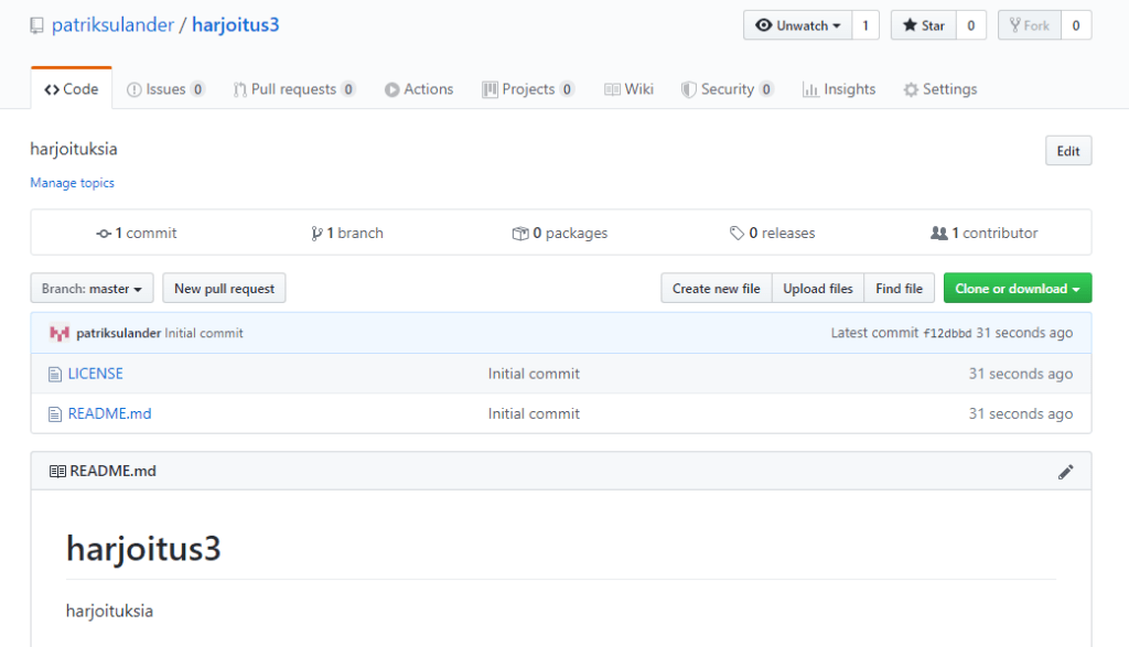 - Loin githubissa uuden hakemiston. (Lisäsin README -tiedoston sekä GNU General Public License v3.0 ja hakemiston nimesin “harjoitus3”