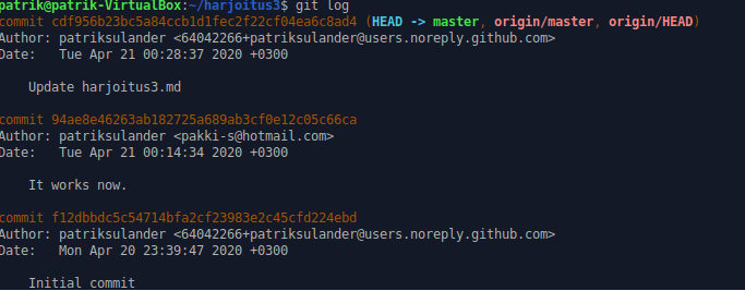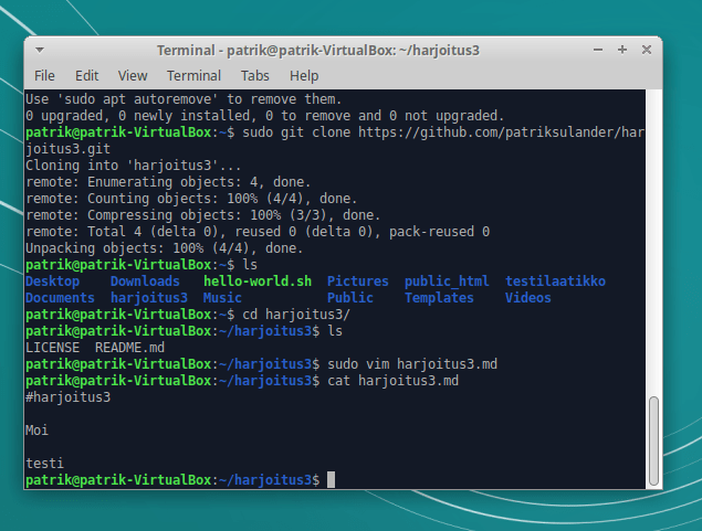 - Kloonasin uunituoreen hakemistoni virtuaalikoneelle –>git clone https://github.com/patriksulander/harjoitus3.git