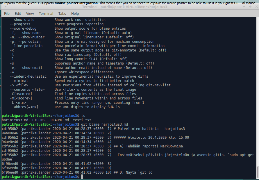 - git blame –> Komento näyttää mitä, milloin ja kuka on päivittänyt tiedostoa.