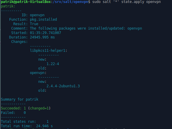 4. sudo salt ‘*’ state.apply openvpn, ajoin komennon kaksi kertaa varmistuakseni modulin asennuksesta.