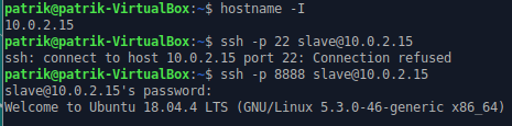 5. Testasin vielä toimivuutta ja porttimuutosta 6. Yritin ensimmäiseksi sisään komennolla --> ssh -p 22 slave@10.0.2.15 = connection refused 7. Sisään pääsin vaihtamalla portin 8888:iin