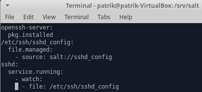 Ensimmäiseksi päivitin järjestelmän ja päätin vaihtaa SSH -porttia saltin avulla: http://terokarvinen.com/2018/pkg-file-service-control-daemons-with-salt-change-ssh-server-port 1.sudo apt-get update 2. Loin tilan /srv/salt/ kansioon --> sudo vim sshd.sls ja muokkasin sen sisällön kuvan mukaiseen kuntoon:
