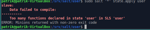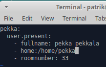 1. Seuraavaksi päätin kokeilla user.present tilaa ja luoda uuden käyttäjän. Apuna tässä käytin Learning SaltStack, Second Edition (Colton Myers, 2016) kirjaa. 2. Loin /srv/salt/ hakemistoon kansion "user" 3. Seuraavaksi loin tilan --> sudo vim init.sls
