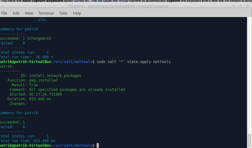 4. sudo salt ‘*’ state.apply nettools, suoritin komennon kaksi kertaa varmistaakseni sen muuttumattoman tilan, toimii!