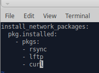 En keksinyt enempään millään, niin käytin saltstackin tutoriaalia hyödyksi: https://docs.saltstack.com/en/getstarted/fundamentals/states.html