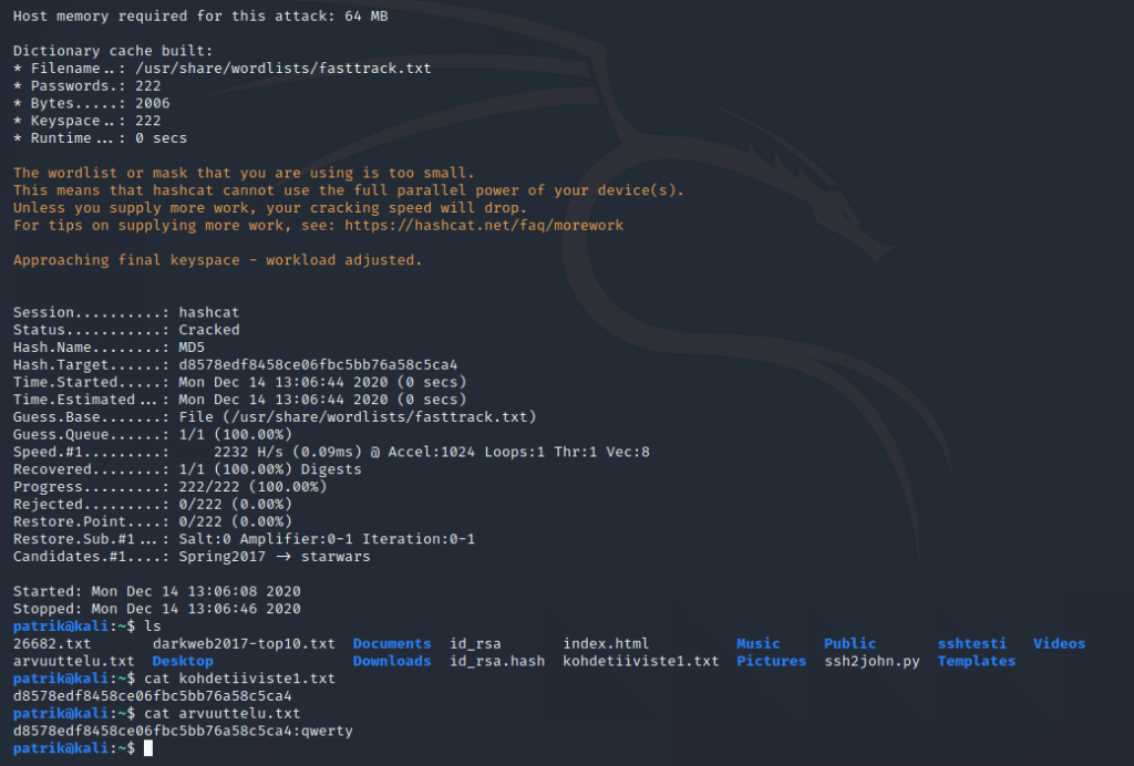 - hashcat -m 0 -a 0 -o arvuuttelu.txt kohdetiiviste1.txt /usr/share/wordlists/fasttrack.txt