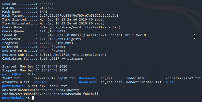 - hashcat -m 100 -a 0 -o arvuuttelu.txt kohdetiiviste2.txt /usr/share/wordlists/fasttrack.txt