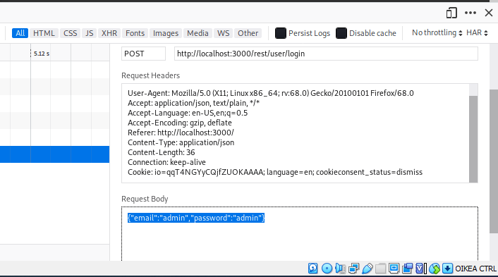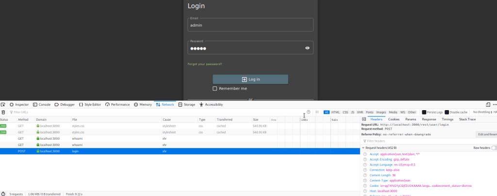 - Ensiksi tiedustelin vielä hieman lisää, testasin lomaketta yrittämällä perus admin, admin -tunnuksia ja selasin F12:lla network -välilehdestä post requestia. Otin nyt ainakin polun kohteeseen ylös = Request url: http://localhost:3000/rest/user/login ja seuraavaksi päätin hieman tutustua tarkemmin hydraan ja sen käyttöön kyseisessä tehtävässä.