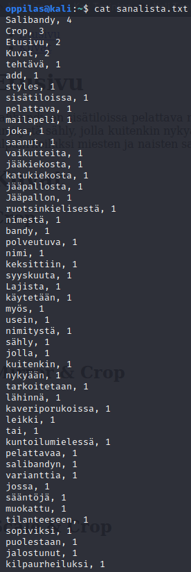 cewl -c -w sanalista.txt localhost - -c (laskee kuinka monta kertaa sana esiintyy sivustolla), -w (tulostaa tiedot tiedostoon)