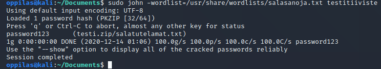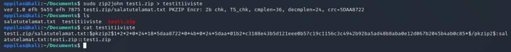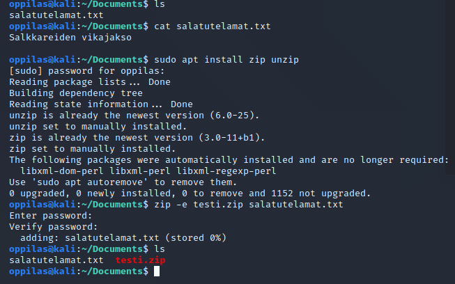 - Loin testi.zip -tiedoston, jonka suojasin salasanalla password123 –> zip -e testi.zip salatutelamat.txt